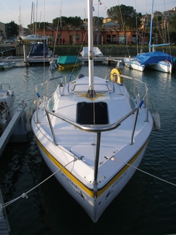 l? albero (con drizze interne) e boma sono in lega leggera anodizzata, bulbo in ghisa, timone a barra, boccaporto di prua e comodi gavoni sotto seduta.